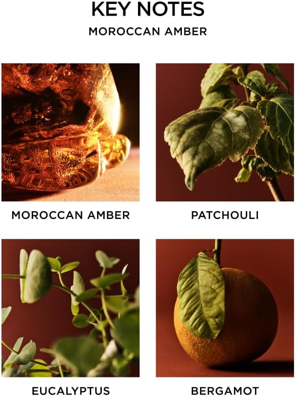 • EARTHY & WOODY - An alluring blend of Moroccan amber, sweet patchouli, heliotrope, and bergamot accented with a hint of eucalyptus that creates an exotic atmosphere.