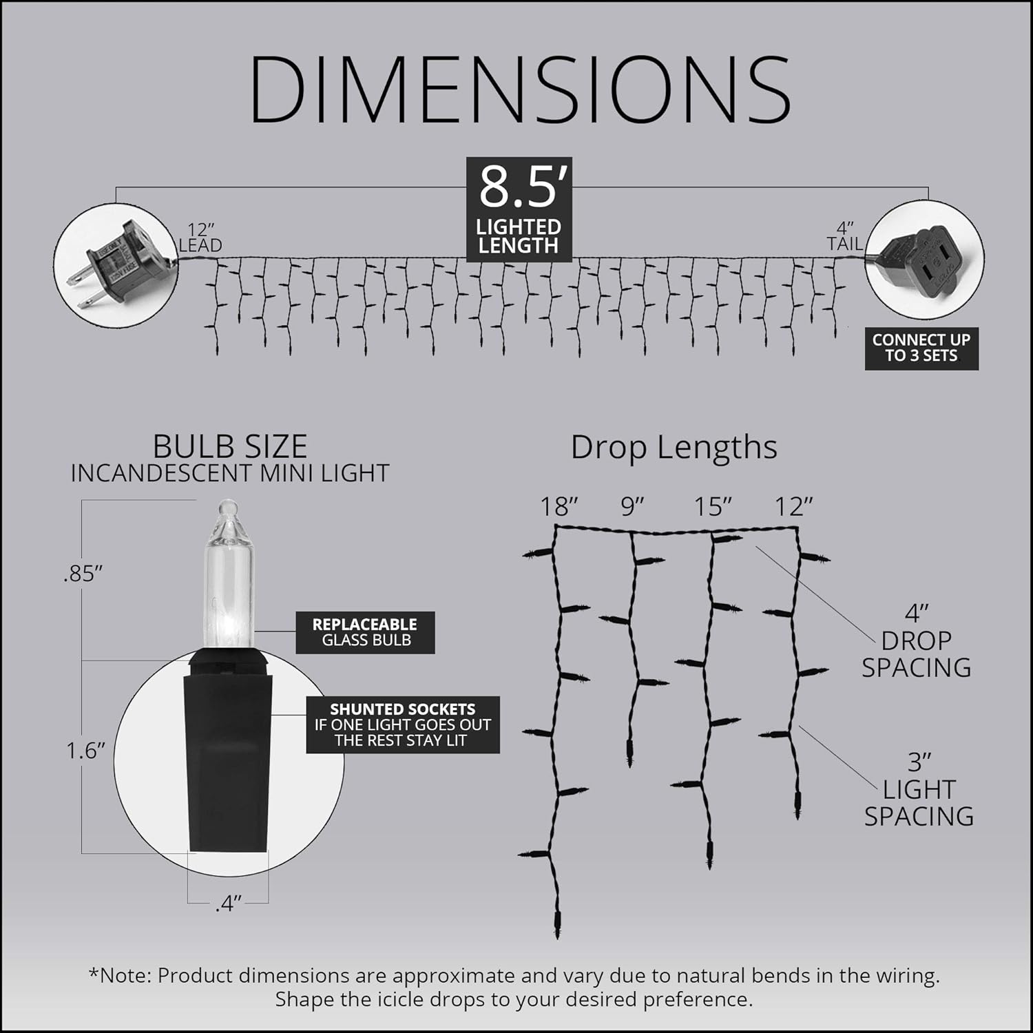 • ** INCANDESCENT ICICLE LIGHTS ** 150 traditional clear incandescent icicle lights on white wire, 27 vertical drops in lengths of 18", 9", 15", and 12"; approximately 8.5 ft. lighted length, 12” lead, 4” tail.