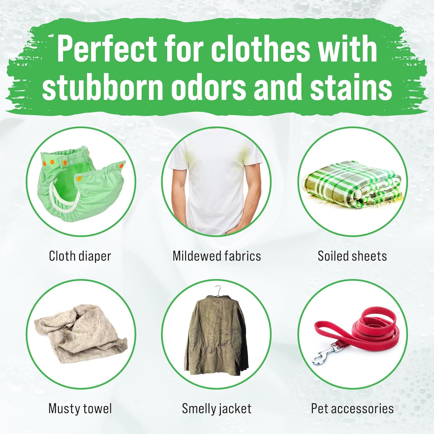• Powerful Odor Eliminator - Say goodbye to stubborn stinky build-ups with our laundry odor eliminator for clothes! Rockin Green Funk Rock is a deep-cleaning plant-based laundry soap powder that targets nasty biological stains and odors at the source for towels, sheets, clothes, and cloth diapers.