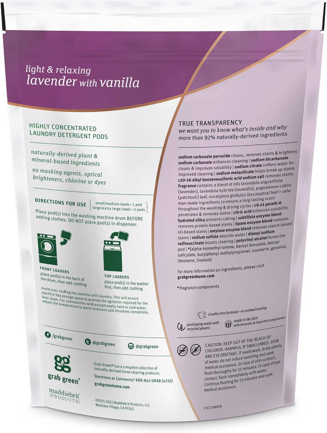 • Contains: 1- 24 Pod Bag of Grab Green Natural Lavender with Vanilla 3in1 Laundry Detergent Pods. Our velcro closure bags are convenient and easy to use, no hassling with frustrating zip closures