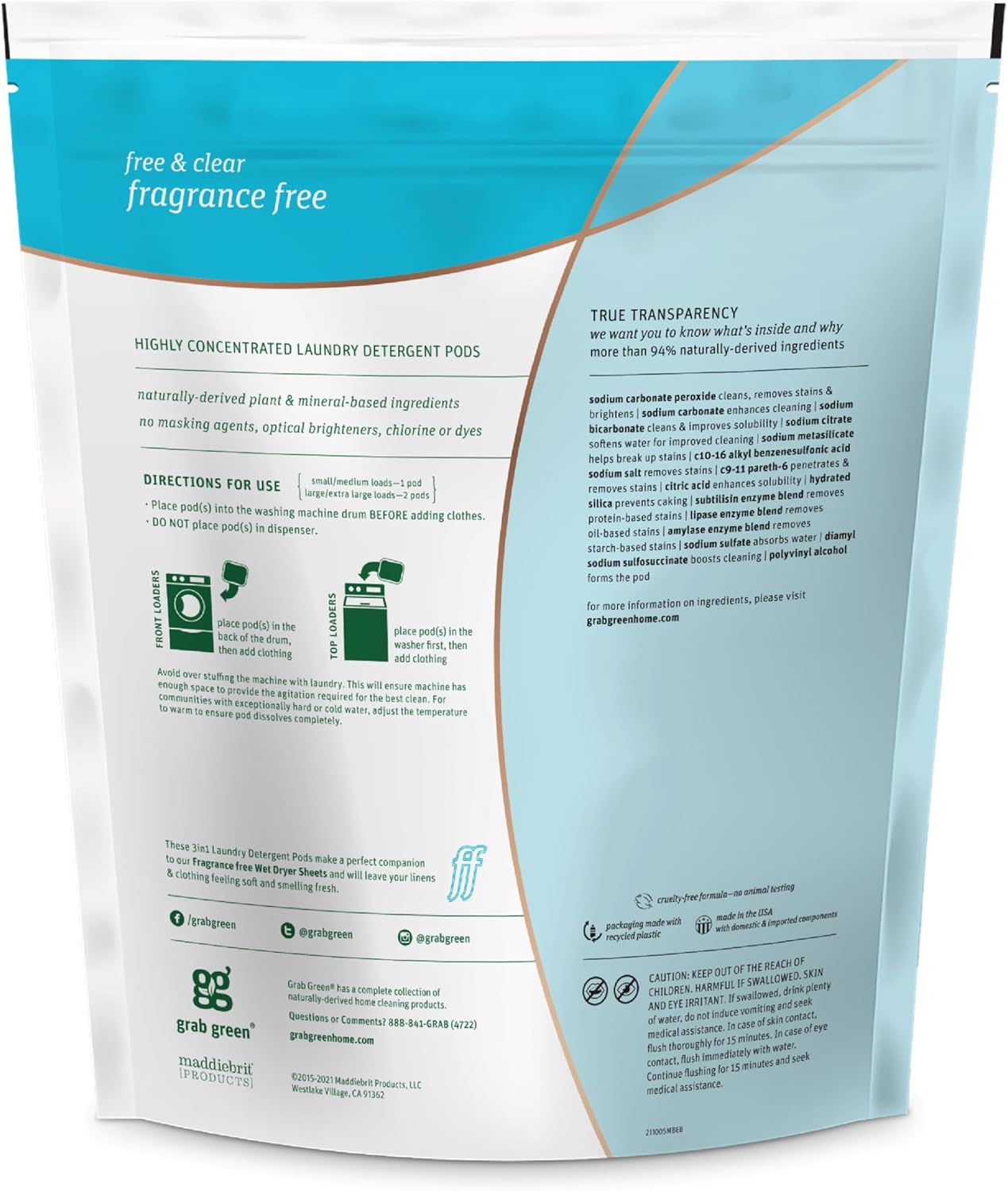 • Contains: 1- 60 Pod Bag of Grab Green Natural Fragrance Free 3in1 Laundry Detergent Pods. Our velcro closure bags are convenient and easy to use, no hassling with frustrating zip closures