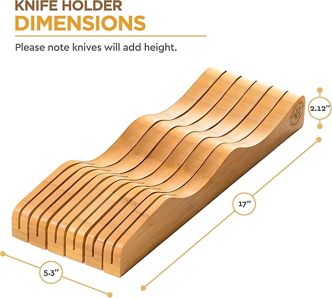 • HIGH QUALITY BAMBOO: This unique drawer knife holder is made of sturdy bamboo wood, which doesn’t ruin your knives’ blades.