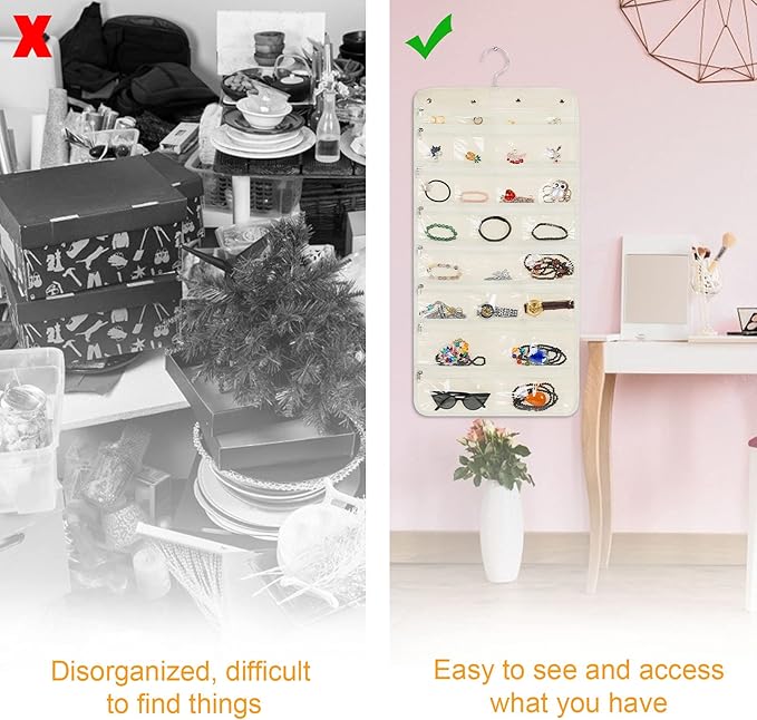 • 2 VERSIONS TO CHOOSE FROM: In addition to the 50 pockets version, we offer an alternative hanging jewelry organizer with 25 transparent pockets and 23 Hooks! Choose whichever fits you and put all your rings, earrings, lockets, necklaces, watches, brooches, pins and other jewelry in order!