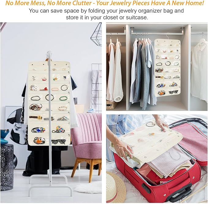 • 360 degree rotational hanger and Secure Zipper Closure, Never have to worry your jewelries ever fall down again and browse its pockets and loops easier than ever.