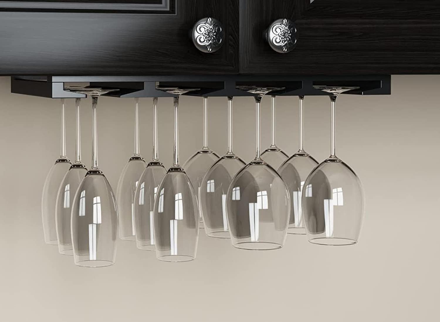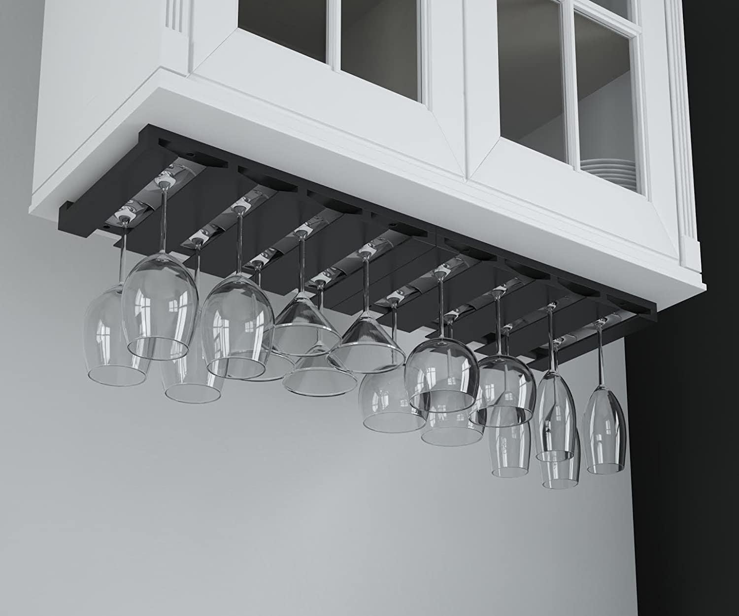 • EASY TO INSTALL - Get your glasses off the counter in less than 5 minutes. Easy to mount under cabinet with the screws provided. Fits 6 to 12 glasses (depends on the diameter of the glass base)