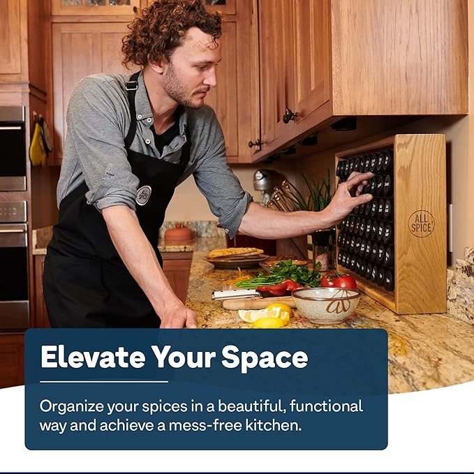• 30 Jar Spice Rack Organizer - Simplify and elevate your herbs, spices and seasonings organization with an AllSpice Wooden Spice Rack. Complete with 30 4oz / 1/2 c refillable empty glass jars and three lid variations, including shaker and scraper tops