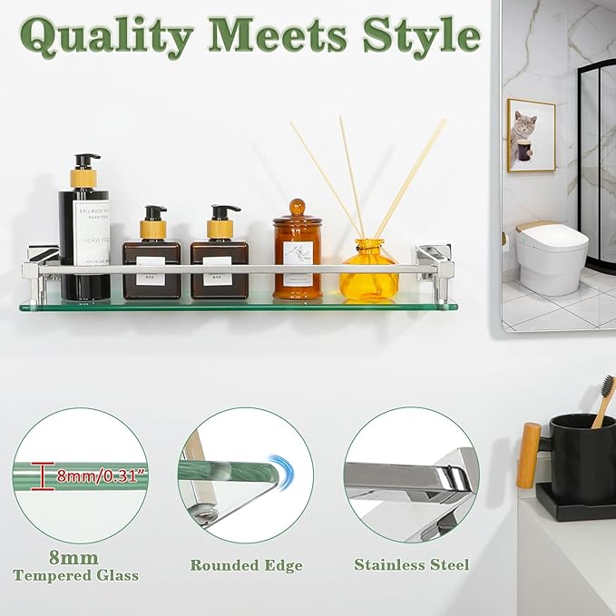 • VERSATILE INSTALLATION:These glass shelving is easy to install with included hardware, suitable for a variety of settings including bathrooms, kitchens, and living rooms