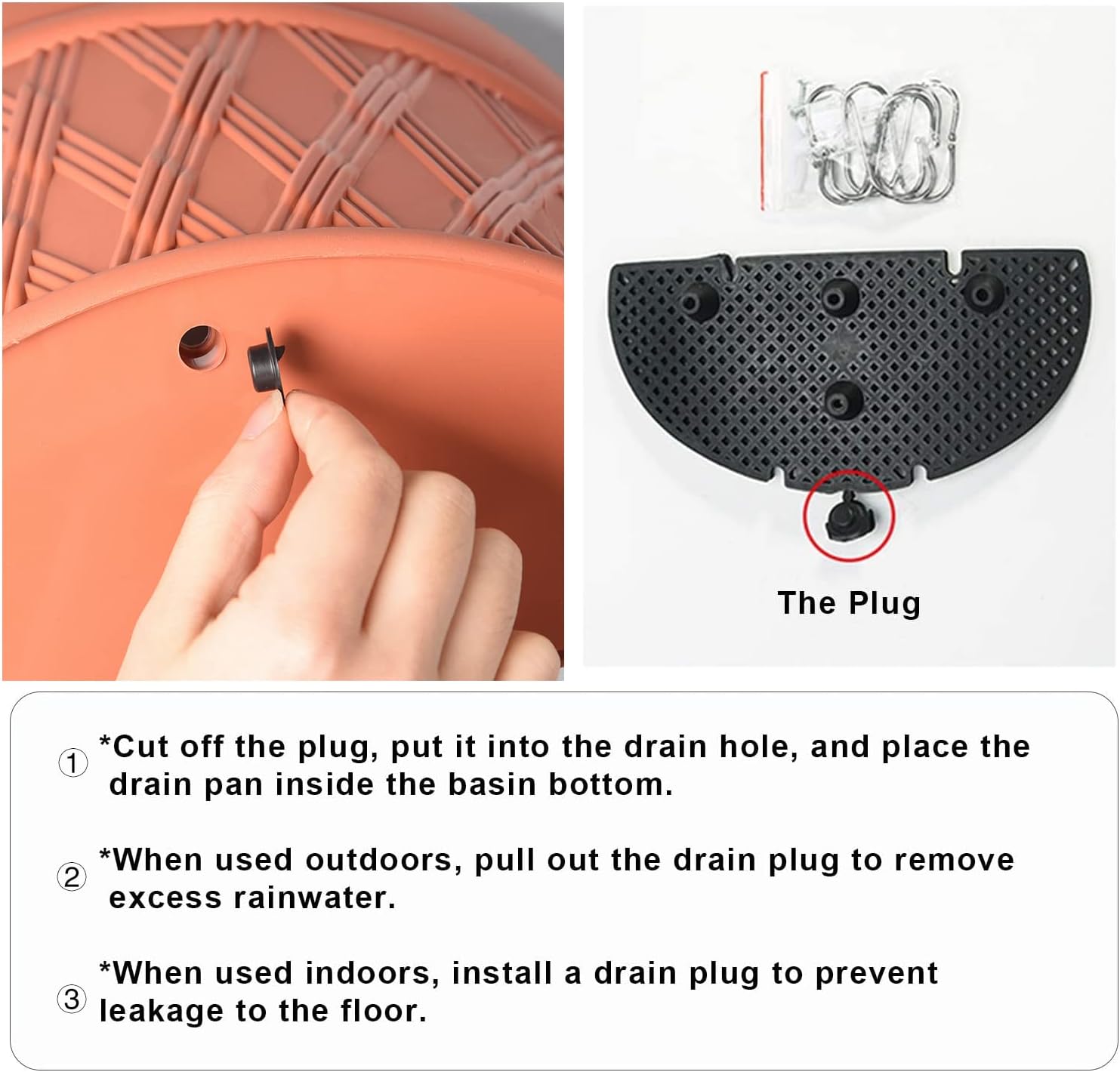 • Use instruction: Cut down the plug and put it into the drain hole,then place the drain pan at the pot bottom. Pull out drainage plug to allow for the removal of excess rainwater when installed outdoors. Install drainage plug when used indoors.
