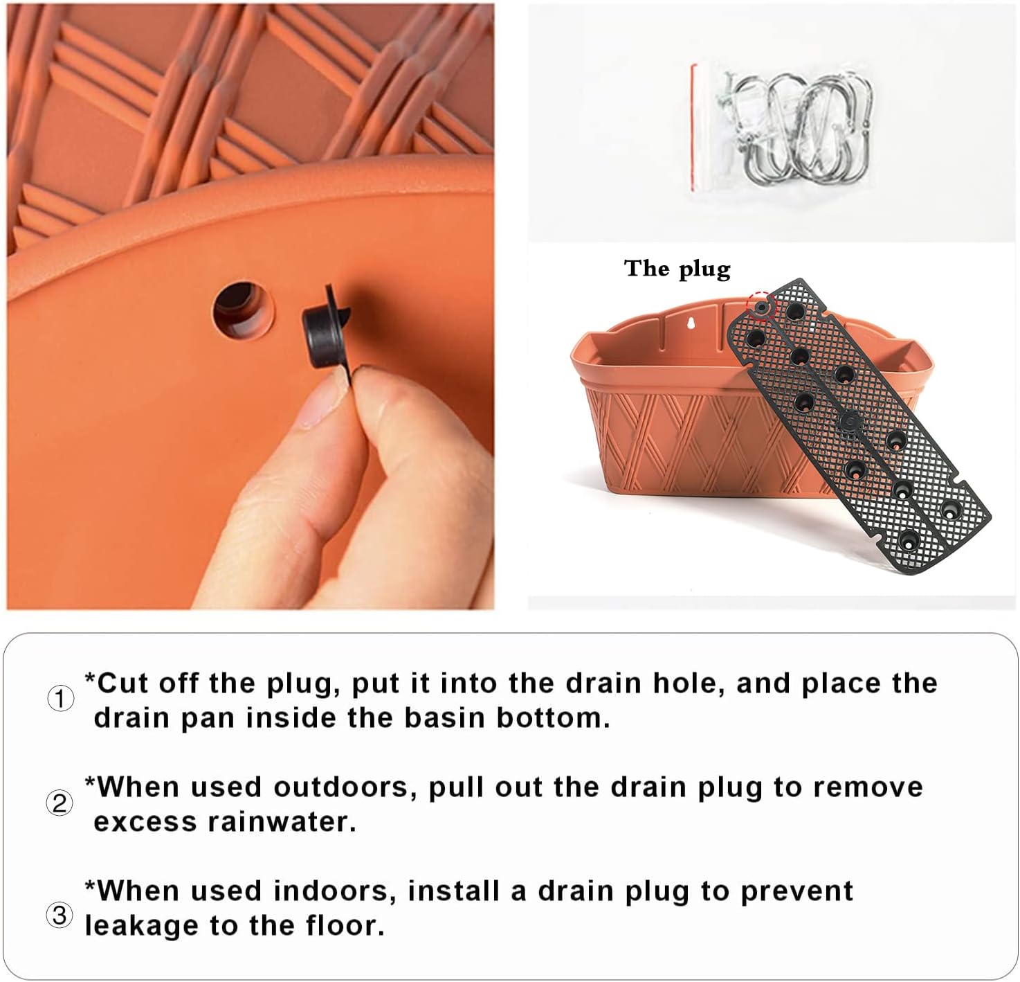 • Use instruction: Cut down the plug and put it into the drain hole,then place the drain pan at the pot bottom. Pull out drainage plug to allow for the removal of excess rainwater when installed outdoors. Install drainage plug when used indoors.