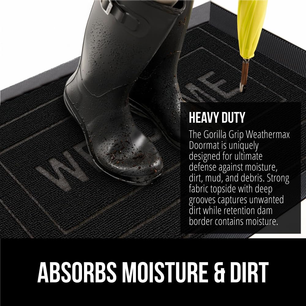 • THE ORIGINAL WEATHERMAX ALL SEASON DOORMAT: Gorilla Grip's Original WeatherMax doormat is built tough with a heavy duty, yet soft and flexible construction; deep grooves, beveled rubber border and retention dam help capture dirt, debris and moisture