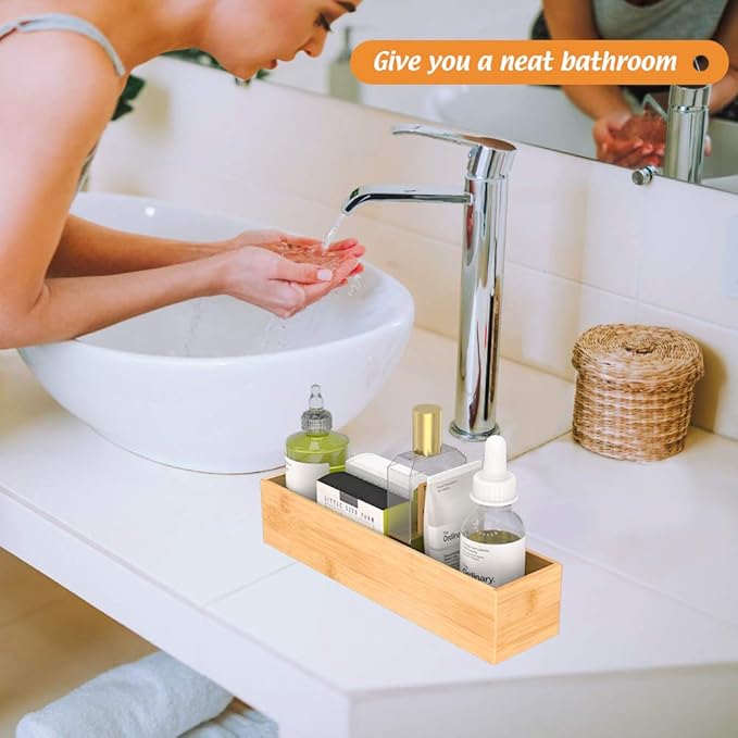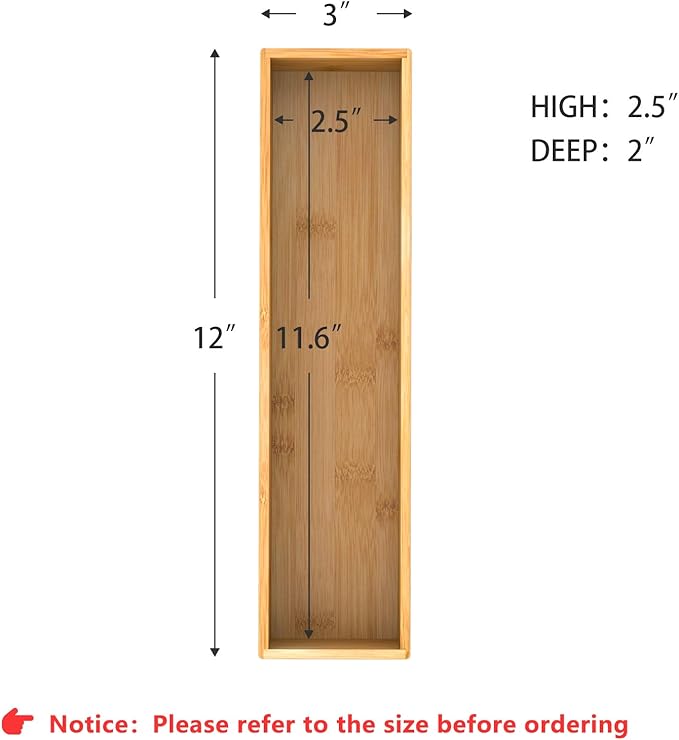 • 【Multi-functional Storage Box】 This deep bamboo organizer boxes are good for organizing items, such as forks, spoons, and knives in kitchen; brushes, soap dispenser and toilet paper in bathroom; cosmetics, makeup tools and hair accessories in makeup room; documents, pens and paper clips in office. Try this bamboo storage box organizer - ending clutter in your office desk and kitchen drawer.