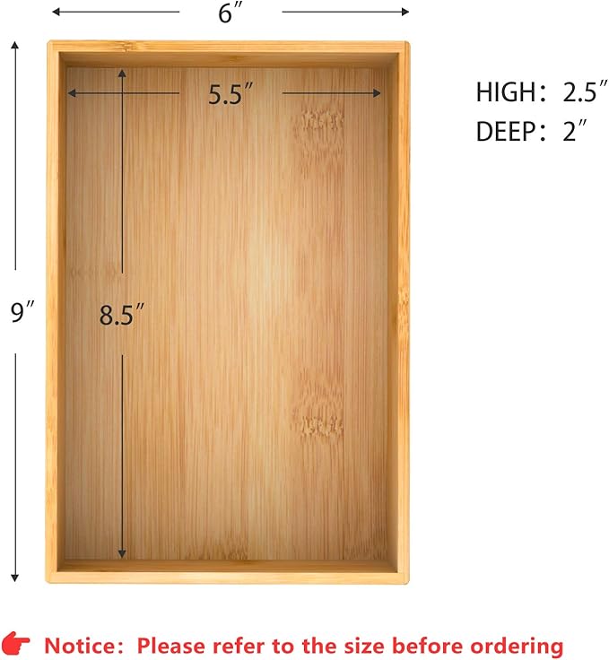 • 【Multi-functional Storage Box】 This deep bamboo organizer boxes are good for organizing items, such as forks, spoons, and knives in kitchen; brushes, soap dispenser and toilet paper in bathroom; cosmetics, makeup tools and hair accessories in makeup room; documents, pens and paper clips in office. Try this bamboo storage box organizer - ending clutter in your office desk and kitchen drawer.