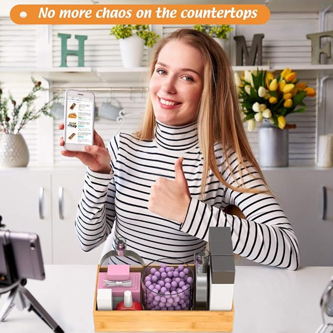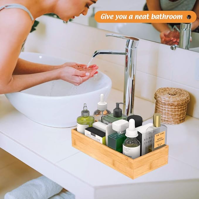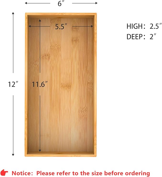 • 【Multi-functional Storage Box】 This deep bamboo organizer boxes are good for organizing items, such as forks, spoons, and knives in kitchen; brushes, soap dispenser and toilet paper in bathroom; cosmetics, makeup tools and hair accessories in makeup room; documents, pens and paper clips in office. Try this bamboo storage box organizer - ending clutter in your office desk and kitchen drawer.