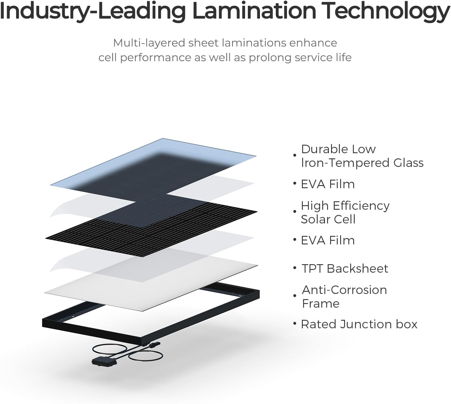 • 【Remarkable efficiency】Renogy solar panels using grade A plus monocrystalline solar cells. Advanced smart PWM technology charge controllers ensure charging efficiency and safety.