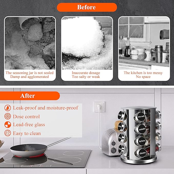 • 【Safe & Durable Material】Our rotating revolving spice rack is made of high quality stainless steel, strong and durable. The glass jar is made of lead-free glass, which is safe and secure to store the spices, and the transparent jar body is convenient for observing the spices.