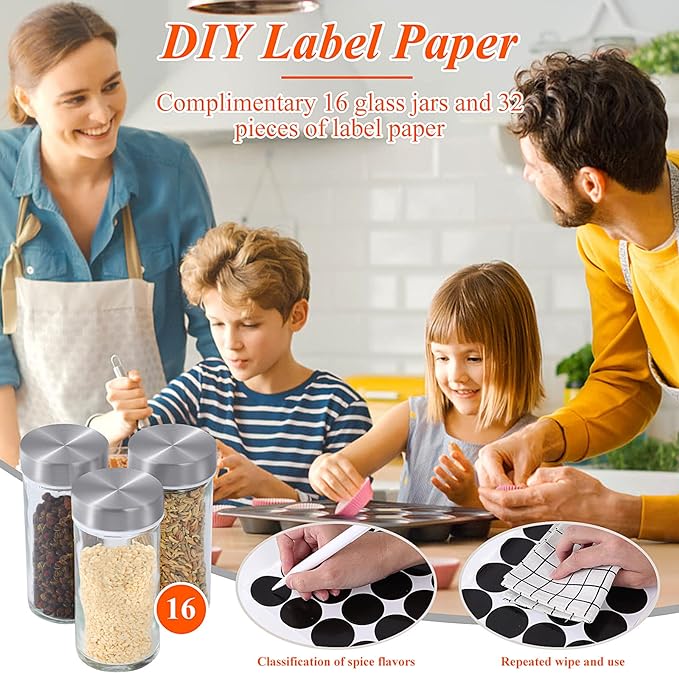 • 【Pre-printed & DIY Lable Stickers】The seasoning organizer is equipped with 144 pre-printed labels, 36 blank labels and a DIY white marker to label each spice. You can mark the seasonings and spices what you put on each glass bottle, which is convenient for you to identify and find.
