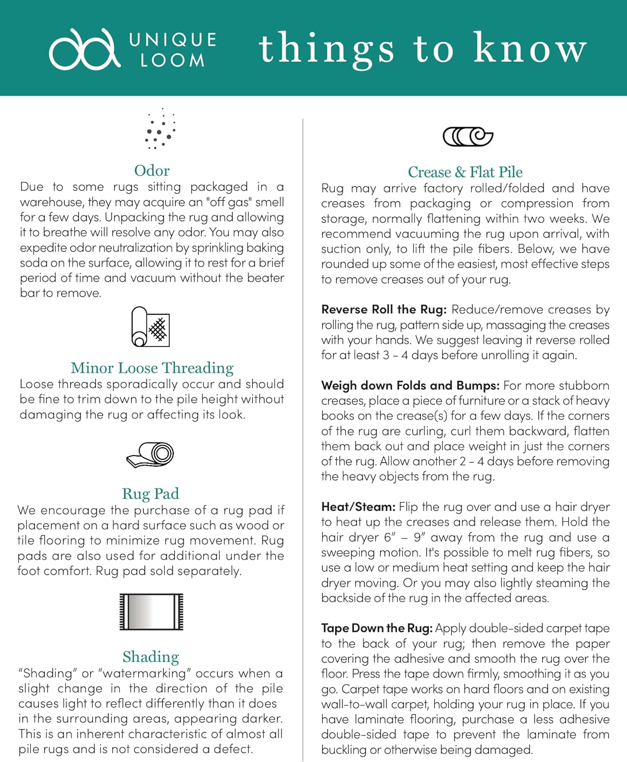 • Size in FT: 4' 0 x 6' 0 - Size in CM: 125x185 - Pile Height & Thickness: 1/2" - Colors: Gray, Ivory