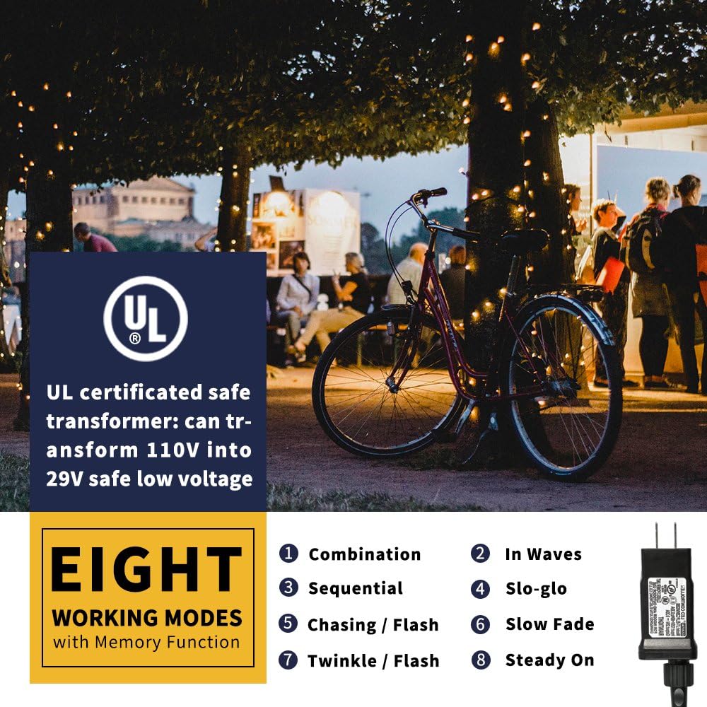 • 29V Low Voltage and UL Certified, Safe to Use:New generation 29V low voltage transformer and whole set string lights including string wire, LED bulbs and plug have been certified by UL to ensure & maximize the safety. Meets UL588 standard for safety of Holiday/seasonal decorative light, much safe to use. Perfect for Christmas, halloween, Easter, weddings, party, festival, holiday decoration.