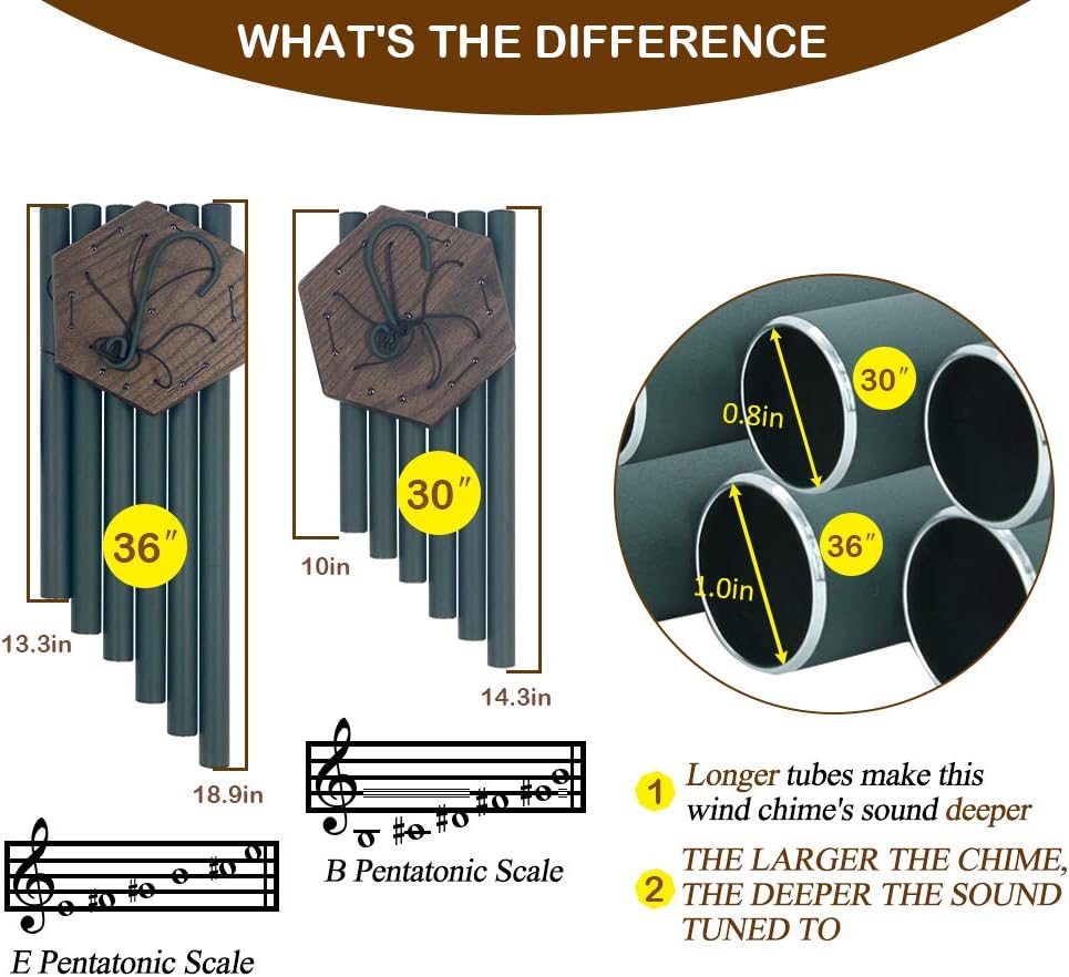 • ♪ Large Wind Chimes Outdoor - Total hanging overall length is 36”with a stronger metal hook. Large wind chimes produce lower, fuller ,deep tone.6 aluminum powder-coated tubes are hand-tuned by our professional tuning experts to achieve a superior musical performance.Heavy duty nylon cording high density beech wood striker for a clear tone and resonances.Thick tubing wall creates a longer lasting deep tone.The sound is soft,deep tone and relaxing .