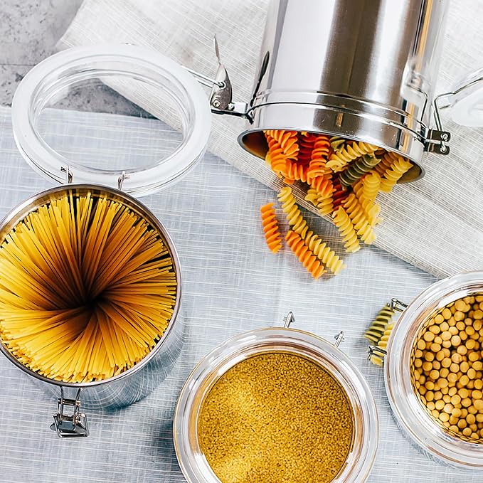• Sweet Design --- Clear clamp lid allow to easy viewing of canister contents. With transparent plastic lid, you will save more time. They are great for storing cookies, coffee, flour, sugar, nuts, coarse cereals and more. This practical canisters set is perfect for various occasion including countertop, restaurants, bistros, pubs, cafe, pantry and so on.