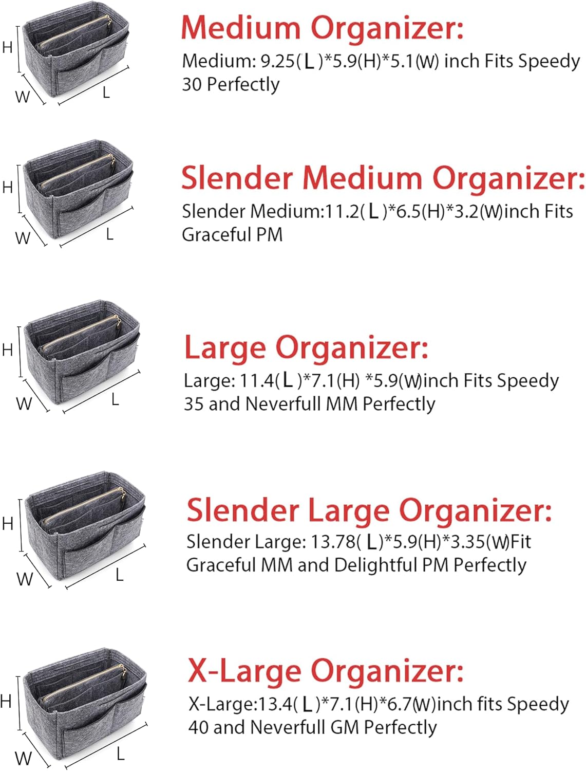 • SIZE OF BAG ORGANIZER: Medium: 9.25(L)*5.9(H)*5.1(W) inch Fits Speedy 30 Perfectly. Slender Medium: 11.2(L)*6.5(H)*3.2(W)inch Fits Graceful PM. Large: 11.4(L)*7.1(H) *5.9(W)inch Fits Speedy 35 and Neverfull MM Perfectly. Slender Large: 13.78(L)*5.9(H)*3.35(W)Fit Graceful MM and Delightful PM Perfectly. X-Large:13.4(L)*7.1(H)*6.7(W)inch fits Speedy 40 and Neverfull GM Perfectly. Portable and Compact Purse Perfectly For any Brand.L*H*W means (Length*Height*Width)