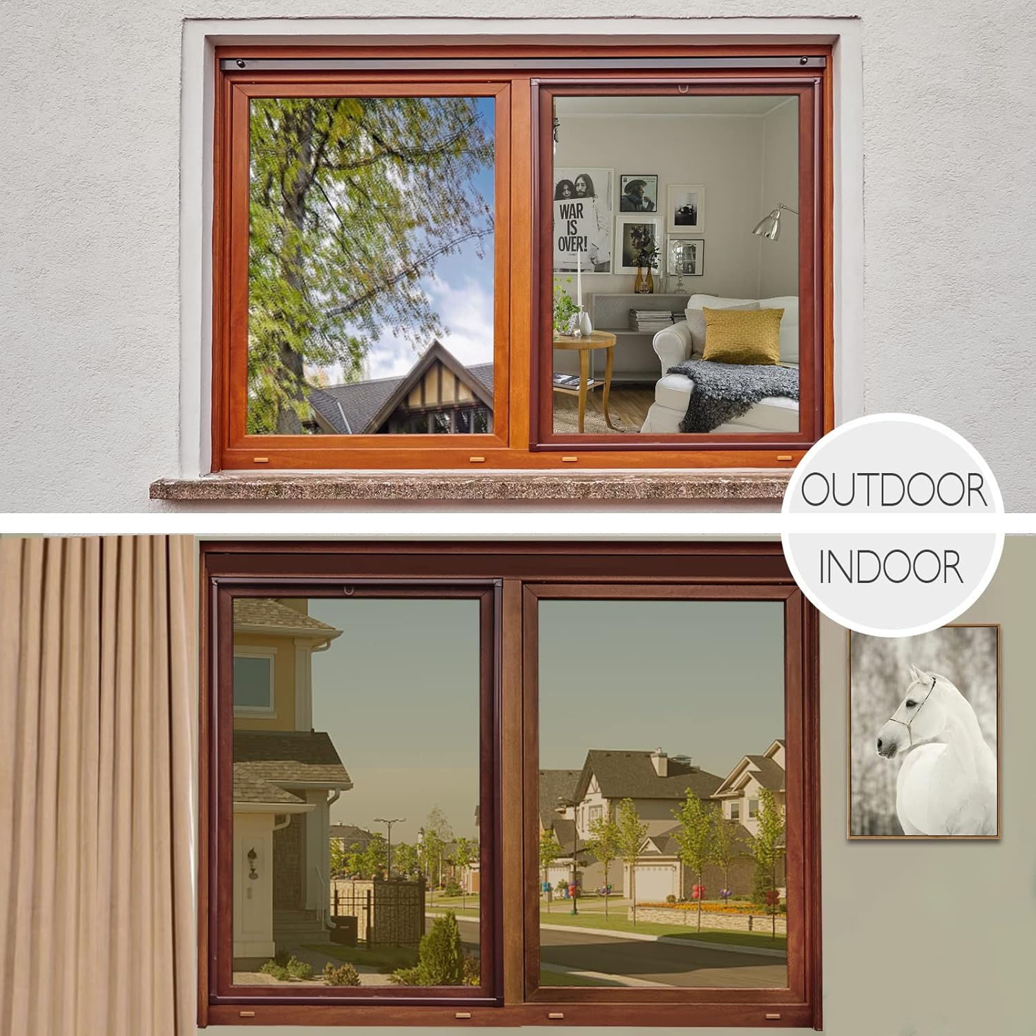 • SUPERIOR DAYTIME PRIVACY PROTECTION – Applying our window privacy film see out not in lets you see out and does not let prying eyes see in during daytime while letting natural lights in, and from the outside, the glass shows a mirror like reflective surface. NOTICE: When the inside light is stronger than the outside light at night, the window film privacy one way CANNOT provide privacy, and the mirror reflective effect will disappear. Do remember to draw the curtains during the night.raw the curtains during the night