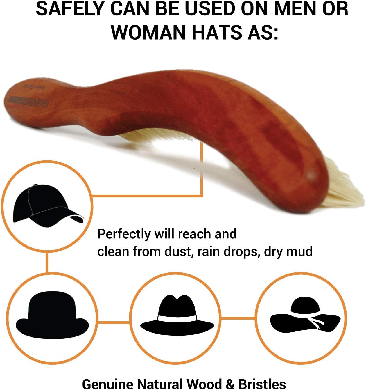 • ⚜️ INTENDED FOR ALL TYPES OF HATS – this 9 inch long cleaning hat was created to serve the owners of any type of hats regardless style or materials made. It will maneuver easily and will eliminate thoroughly any accumulations from leather or textile materials. Safely can be used on men or woman hats as: sun hats, baseball caps, flat caps, newsboy, fedora, trilby, pork pie hat, homburg hats, Panama hat, derby hats. Or just use it on western hats, stockman hats and even trapper hat or stormy kromer