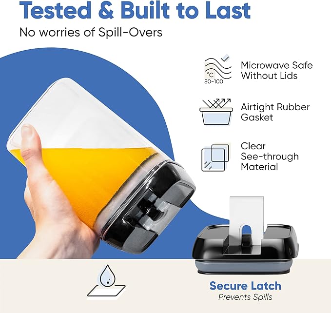 • [Superior Built ] - These flip lock kitchen canisters are 100% airtight and leak proof. These BPA Free clear food storage containers are stain free, easy to clean and portable. Perfect for refrigerator, cabinets and kitchen countertops.