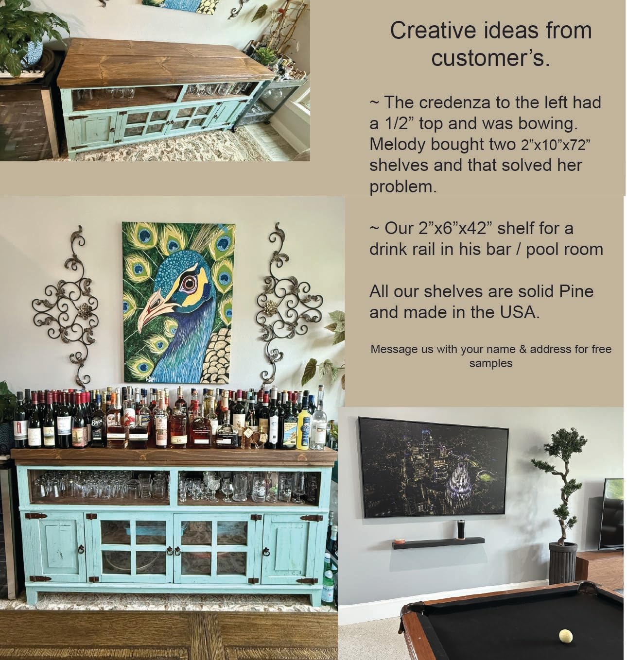 • DIMENSIONS & FIT - BEFORE YOU ORDER: 1. Measure your space, make sure the shelf will fit. 2. If you have any hesitation about color or texture, message us for FREE SAMPLES. It is much easier and less expensive than returning large items. The colors do not look the same from device to device. If you are in question, please use a tape measure before ordering. Sometimes it helps to put painter's tape on the wall to visualize.