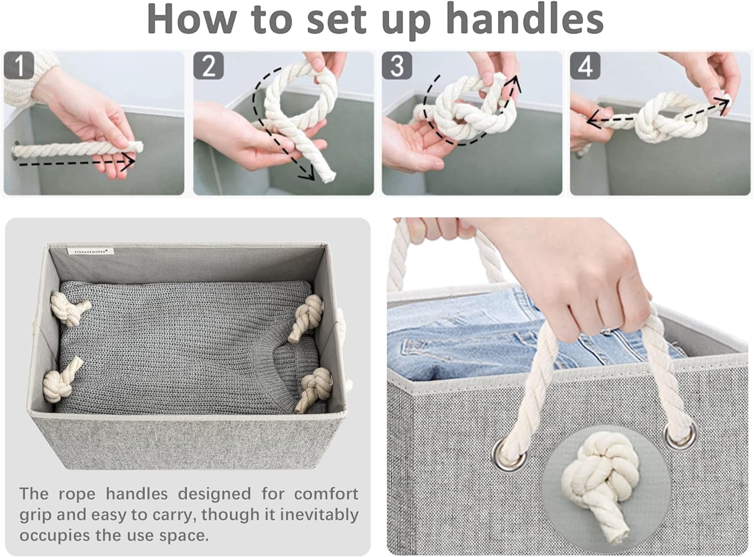 StorageWorks Large Storage Bins with Lids, Decorative Storage Boxes with Lid and Soft Rope Handles, Foldable Storage Baskets for Closet, Shelves, Stackable, Gray, 3-Pack