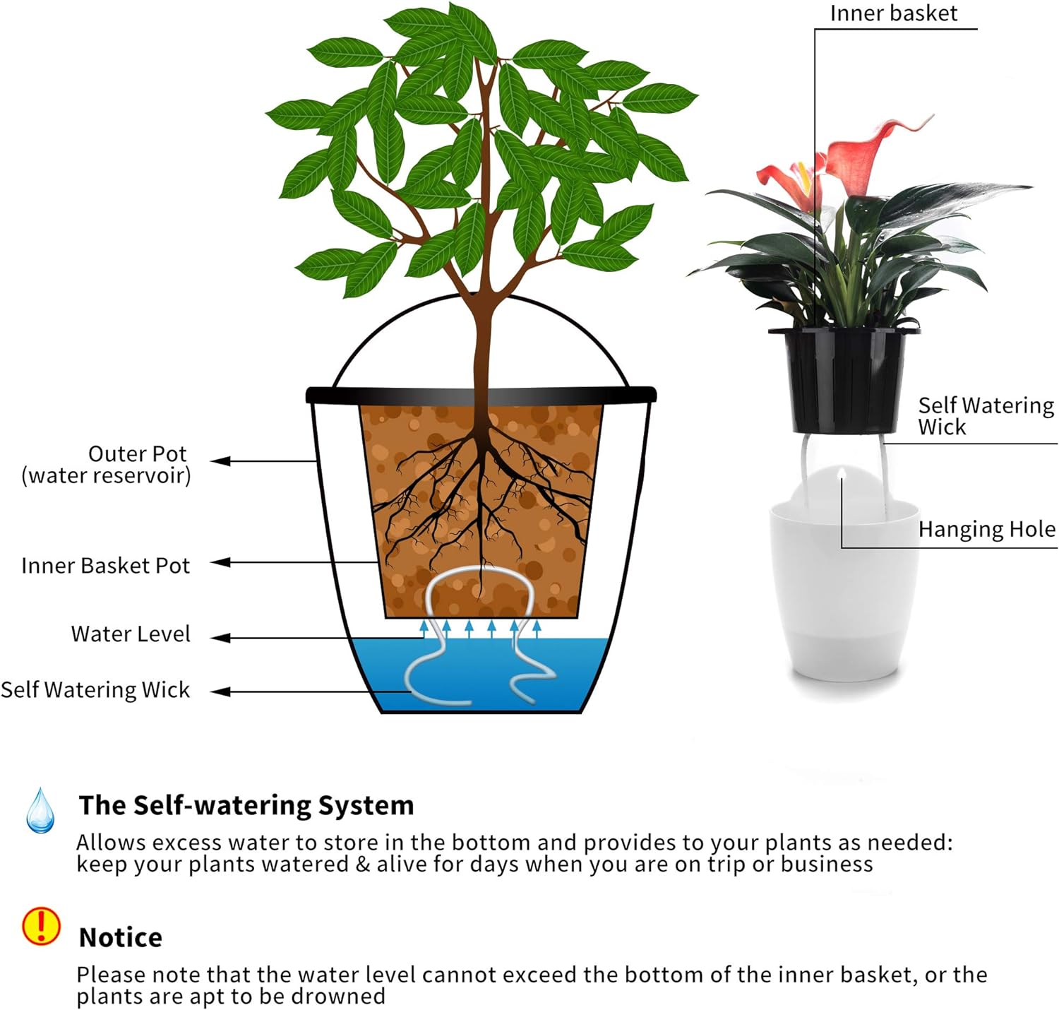 • Self-watering Wall Planter: Hanging planter pots designed with double-layer to allow excess water to store in bottom of this self-watering planter and provide to your plants as needed: automatically suck the water and nutrients up from the bottom of the outer cup via cotton rope wick to ensure plants take enough water they need for days, and you don't have to water them frequently. This clever hanging flower pots may help you care your plants when you go outside a couple days or on business.
