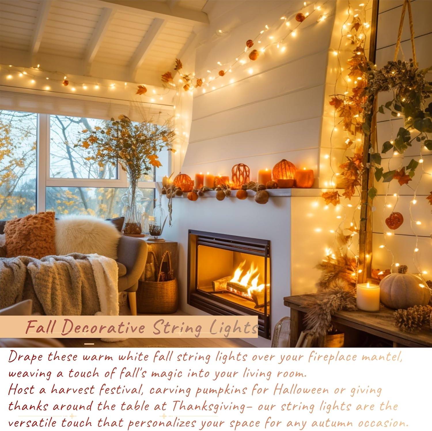• Autumn Decor & Fall String Lights: Warm white string lights, with soft glow, can be used as part of fall decorations to create a cozy and warm atmosphere for celebrating the bountiful harvest season. The fall decor string lights are more than mere decorations. Whether you're hosting a Thanksgiving dinner, a Halloween party, or enjoy the season's changing colors, for wall、table、mantel、fireplace and window, warm white fall string lights are a versatile and elegant choice for fall decorations