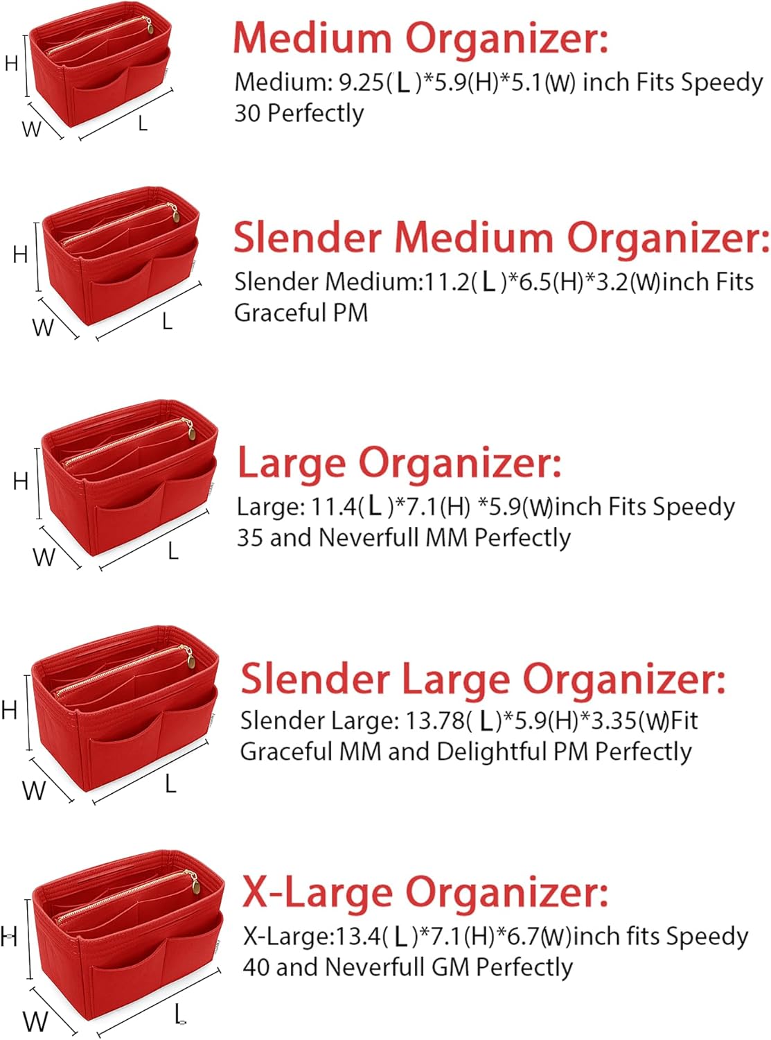 • SIZE OF BAG ORGANIZER: Medium: 9.25(L)*5.9(H)*5.1(W) inch Fits Speedy 30 Perfectly. Slender Medium: 11.2(L)*6.5(H)*3.2(W)inch Fits Graceful PM. Large: 11.4(L)*7.1(H) *5.9(W)inch Fits Speedy 35 and Neverfull MM Perfectly. Slender Large: 13.78(L)*5.9(H)*3.35(W)Fit Graceful MM and Delightful PM Perfectly. X-Large:13.4(L)*7.1(H)*6.7(W)inch fits Speedy 40 and Neverfull GM Perfectly. Portable and Compact Purse Perfectly For any Brand.L*H*W means (Length*Height*Width)