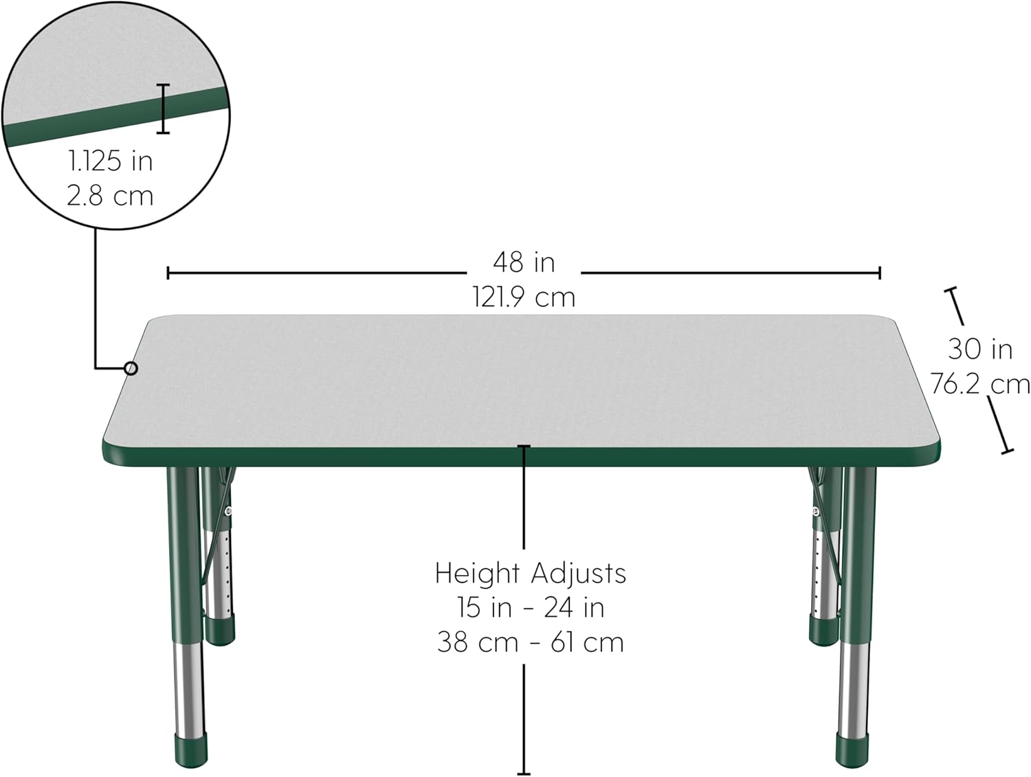 FDP Rectangle Activity School and Classroom Kids Table (30 x 48 inch), Chunky Toddler Legs, Adjustable Height 15-24 inches - Gray Top and Green Edge