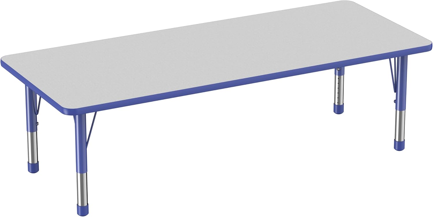FDP Rectangle Activity School and Classroom Kids Table (30 x 72 inch), Chunky Toddler Leg, Adjustable Height 15-24 inches - Gray Top and Blue Edge