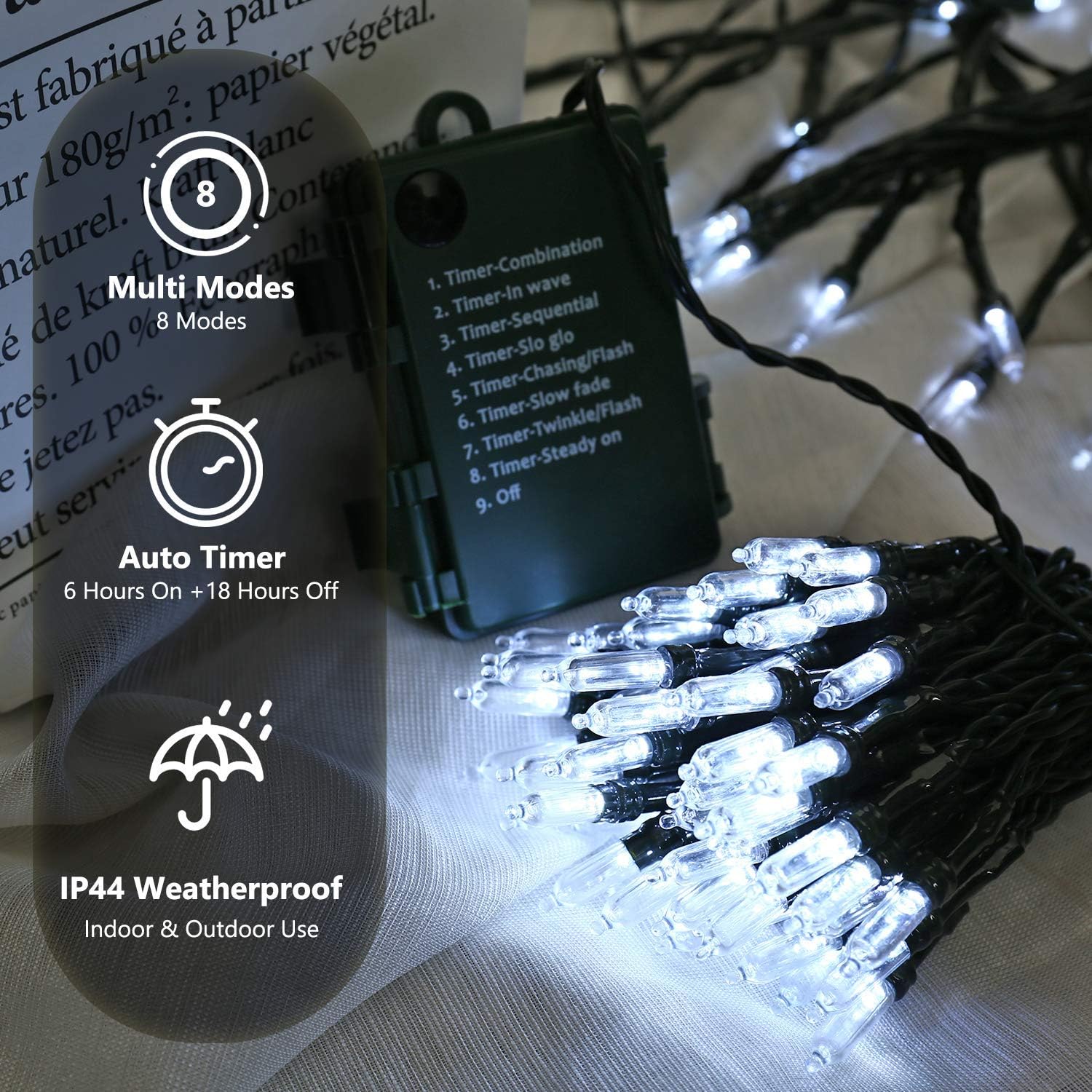 • 8 Modes & Auto Timer: These clear cool white string lights have 8 gorgeous lighting modes with built-in auto-timer 6 hours "ON" and 18 hours "OFF", which starts once you activate any one of the 8 modes on the battery holder, so it will automatically time when the light is on. Note: If you change modes before the timer expires then it will stay on that mode for another 6 hours.
