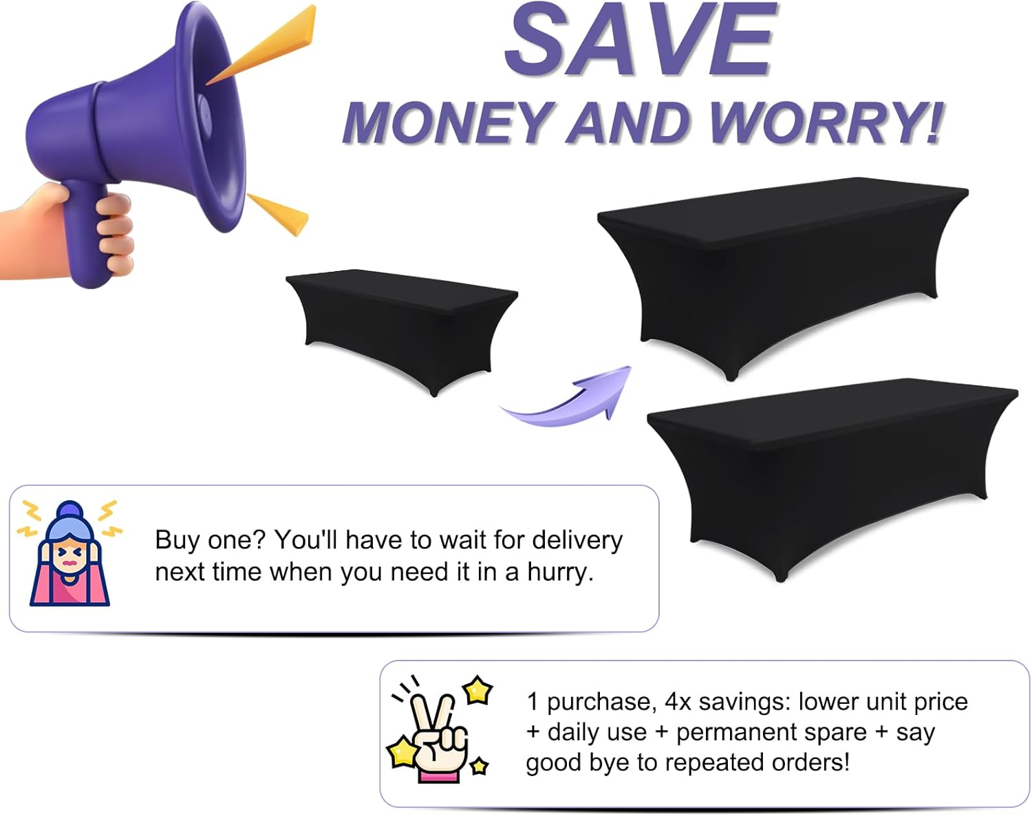 • 3.Which One Should You Choose?: Whether you're using for everyday use in your home or in commercial establishments such as restaurants, hotels and cafes. Our inexpensive rectangle spandex table covers which have the size of 4FT, 5FT, 6FT, 8FT and multicolor will match your table and decor perfectly. Table covers in multipacks are even more cost effective because after taking into account the cost of packaging and transportation.