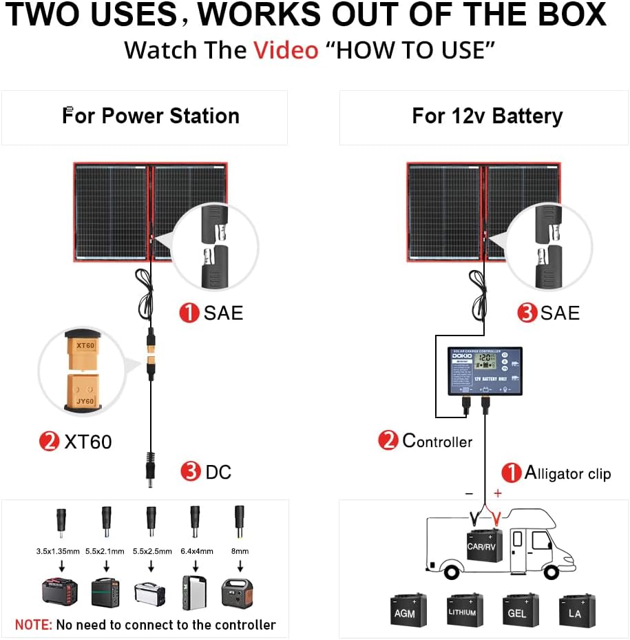 • 【COMPLETE KIT, READY TO GO】 Package includes the 100W foldable panel, separate controller, SAE/XT60/Alligator clips, DC5521/5525/35135/6440 adapters, 9.85ft cable, storage bag, and manual—a one-stop bundle for quick setup.