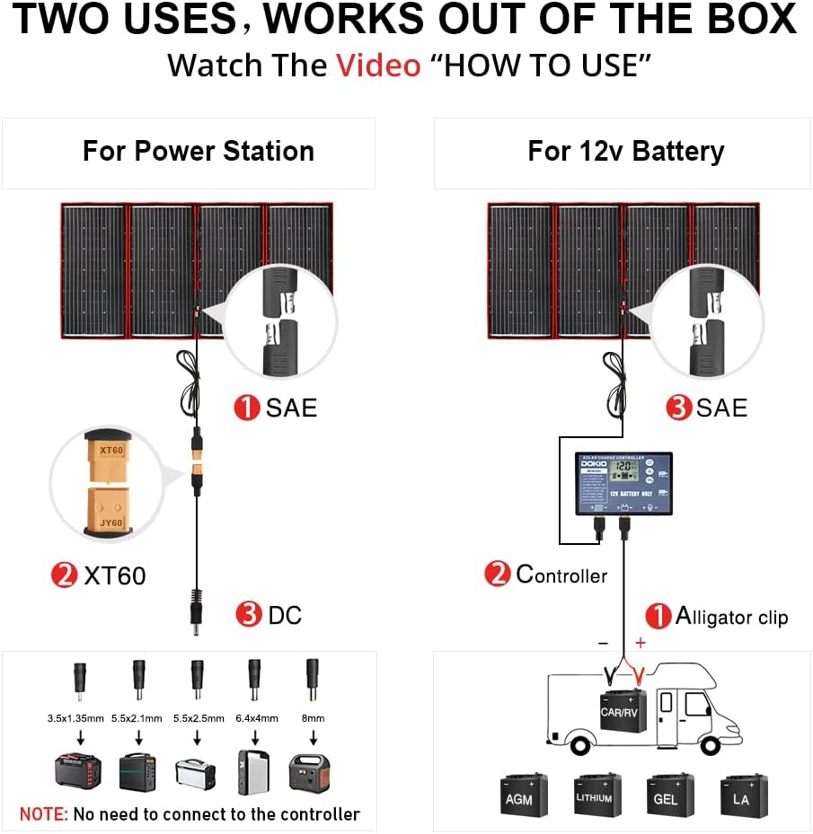• 【COMPLETE BUNDLE READY TO GO】 Includes the 300W foldable panel, separate controller, SAE/XT60/Alligator clips, DC5521/5525/35135/6440 adapters, 9.85ft cable, storage bag, and manual—a one-stop kit for camping, RVing, or emergency backup.
