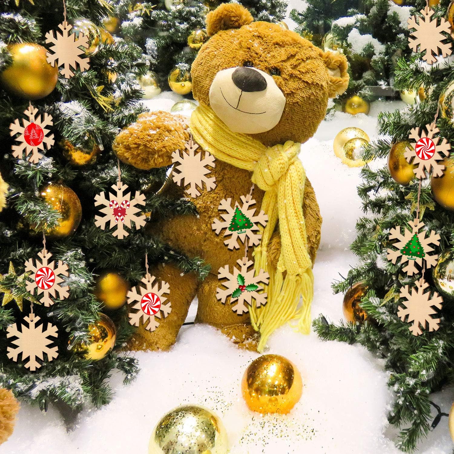 Blulu 60 Pieces Christmas Wooden Ornaments Round Wood Slices Snowflake Angel Shape with Cords for DIY Crafts New Year Christmas Tree Pendant Ornaments