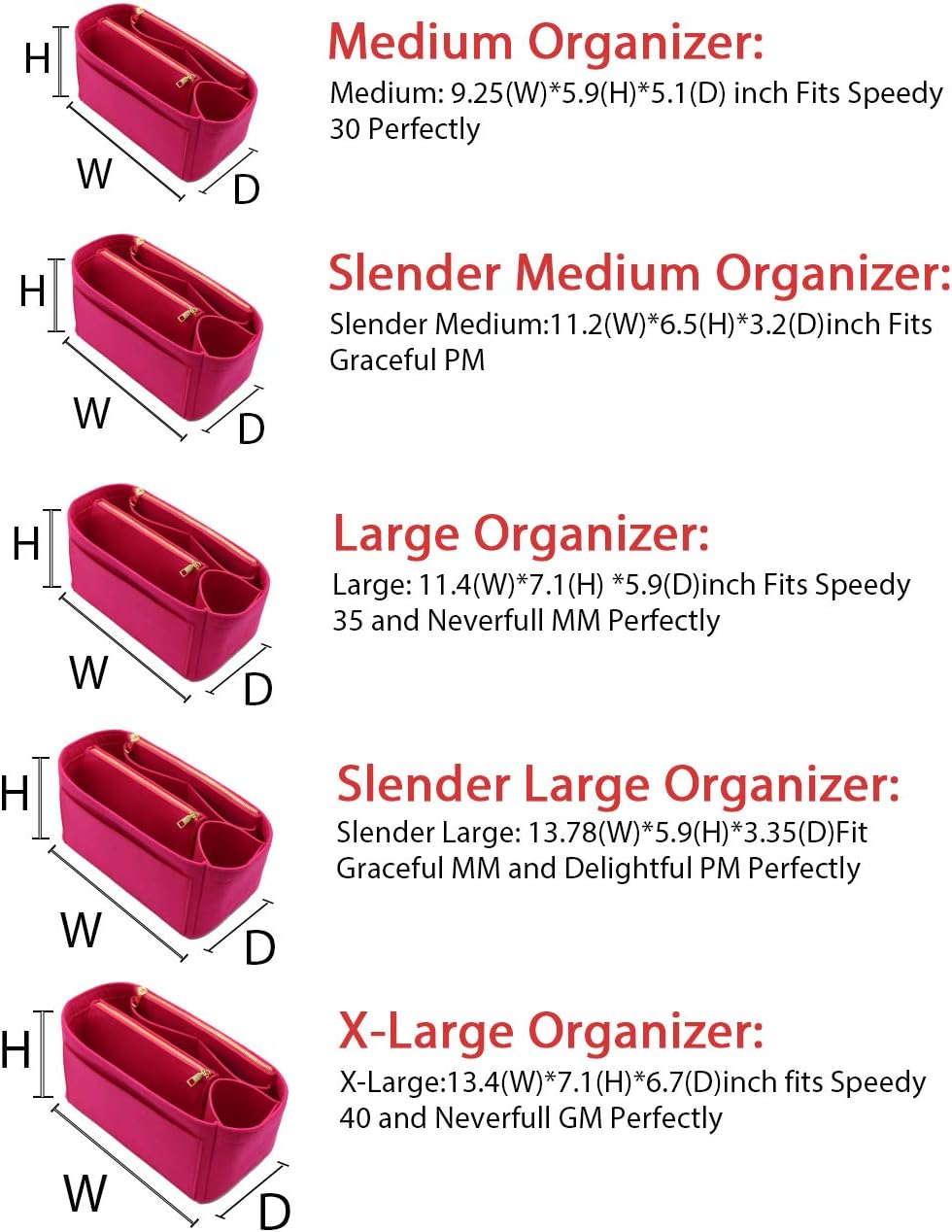 • SIZE OF BAG ORGANIZER: Medium: 9.25(L)*5.9(H)*5.1(W) inch Fits Speedy 30 Perfectly. Slender Medium: 11.2(L)*6.5(H)*3.2(W)inch Fits Graceful PM. Large: 11.4(L)*7.1(H) *5.9(W)inch Fits Speedy 35 and Neverfull MM Perfectly. Slender Large: 13.78(L)*5.9(H)*3.35(W)Fit Graceful MM and Delightful PM Perfectly. X-Large:13.4(L)*7.1(H)*6.7(W)inch fits Speedy 40 and Neverfull GM Perfectly. Portable and Compact Purse Perfectly For any Brand.L*H*W means (Length*Height*Width)