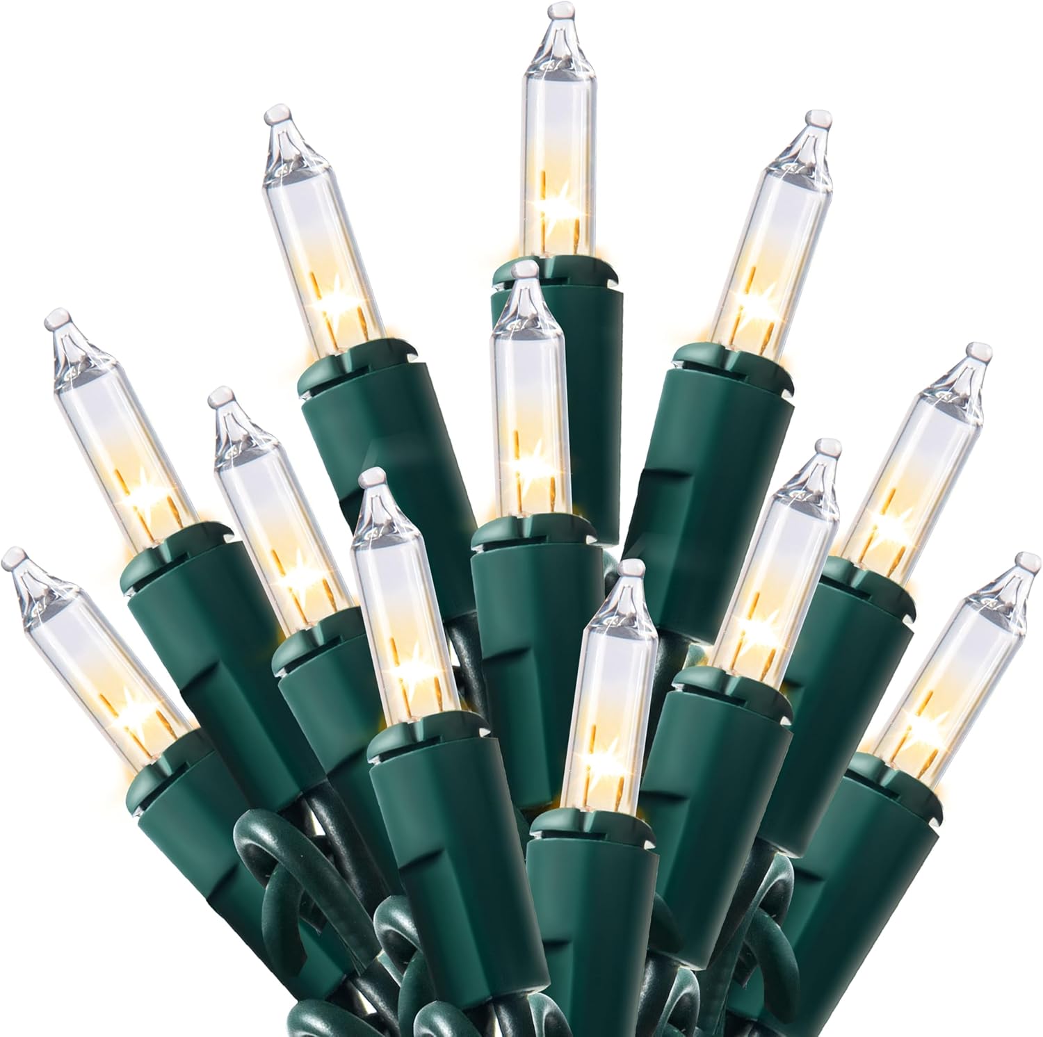 • 100 WARM WHITE MINI LIGHTS - Our Xmas string light total lighted length is 19.4 feet. Total wired length is 21.4 feet. Clear bulb spacing 2.36 inches. Create a magical atmosphere with Old-fashioned tradition bulbs emitting a classic, festive glow. The warm white light is cozy,offer a vibrant, joyful display for any celebration.