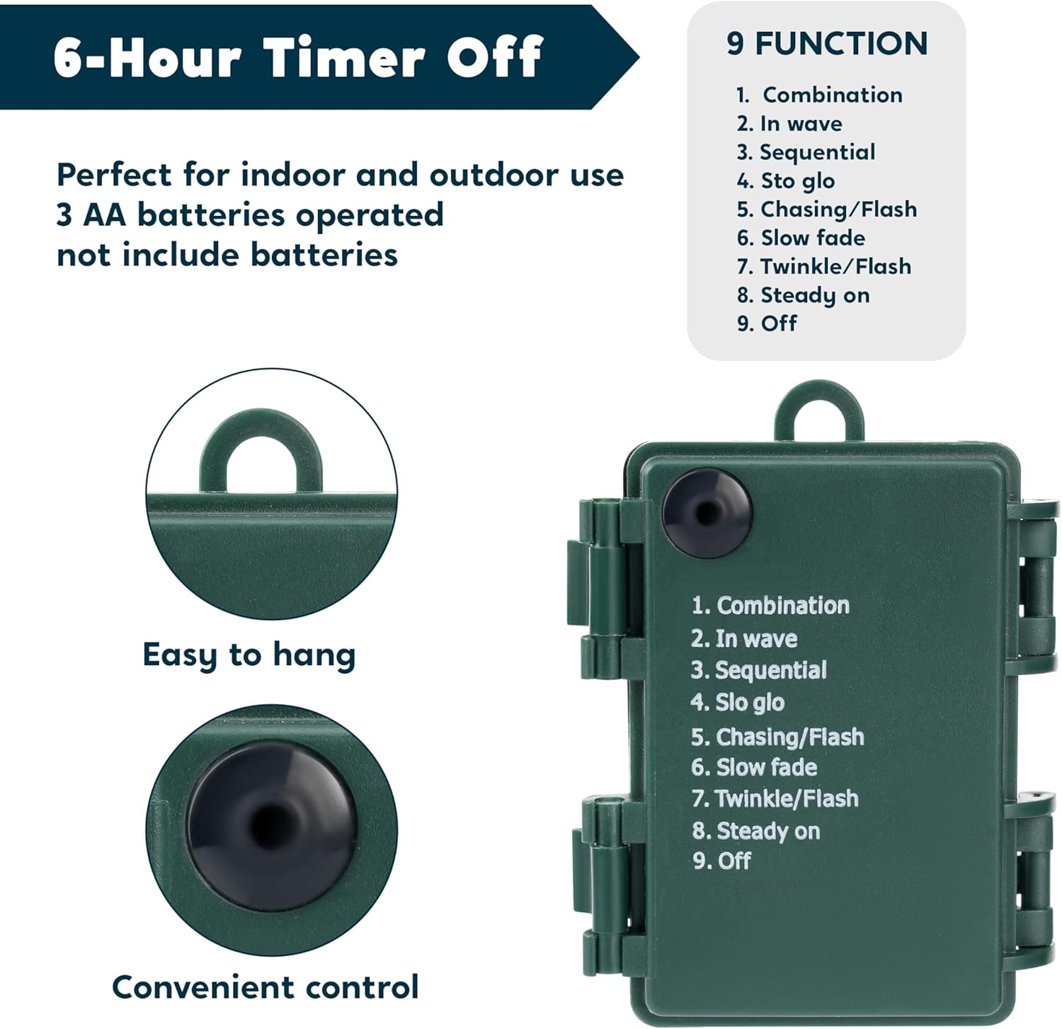 • BATTERY POWERED: This string light is powered by battery box (No timing function) using 3 AA batteries (Batteries Not Included). Just put it wherever you like without the limitation of socket