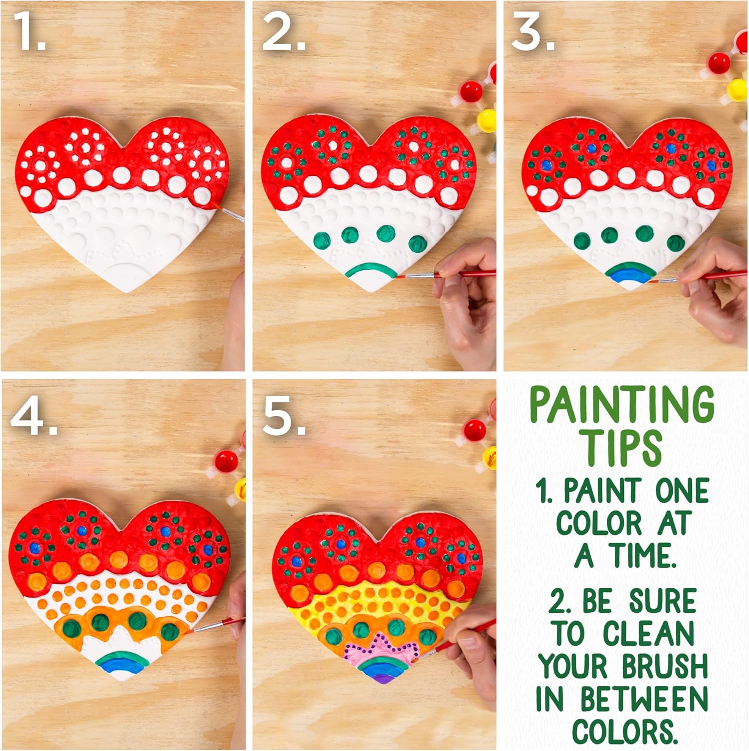 • SET INCLUDES: 1 Ready-to-Paint Ceramic Heart Stepping Stone (7 in x 1 in x 7 in), 1 Acrylic Paint Strip (Red, Yellow, Green, Blue, White, Black, 2.2mL each), 1 Paintbrush, Easy-to-Follow Instructions