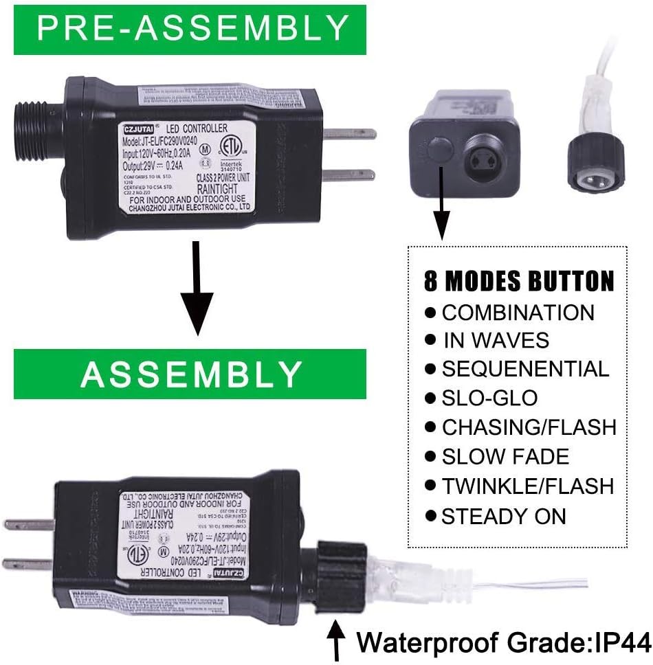 • 8Modes and easy to use:modes including combination, in waves, sequential, slogs, chasing/ flash, slow fade, twinkle/ flash, and steady on. Just use the plug button to adjust 8 modes setting .directly plug in and unplug it for power on and off.