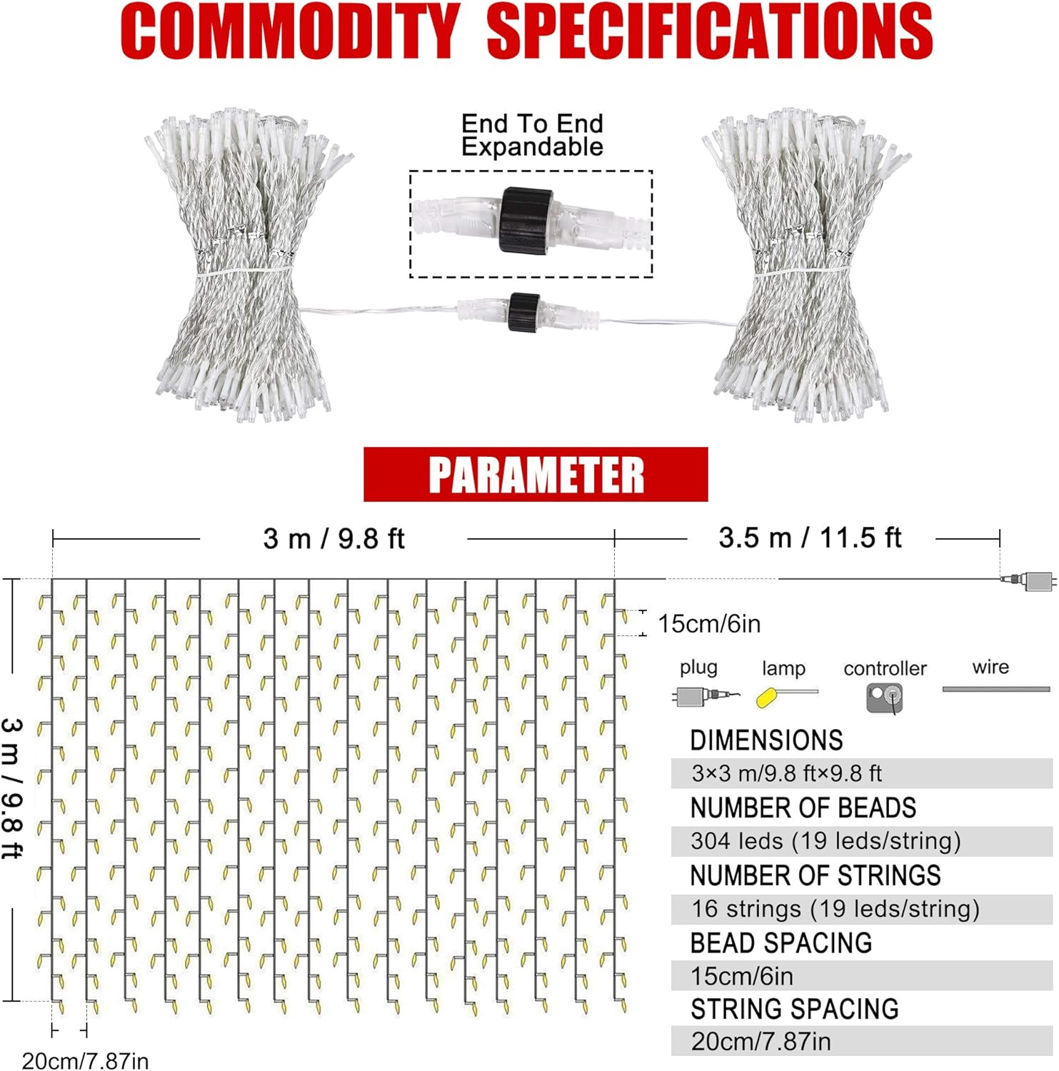 • Length description:9.8ft*9.8ft,with 304LED twinkle bulbs; spacing between every LED: 15cm/6in;It can meanwhile connect of 5 curtain lights;and the12ft lead wire length is enough for you to decorate the place where you want.