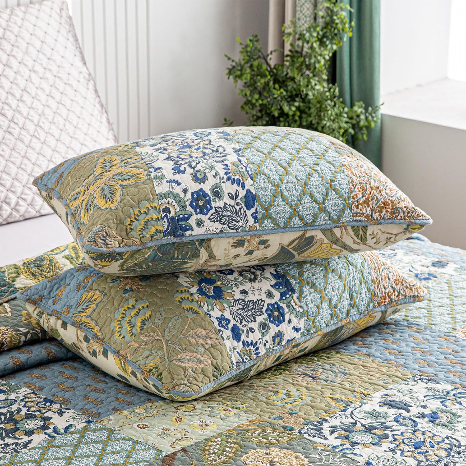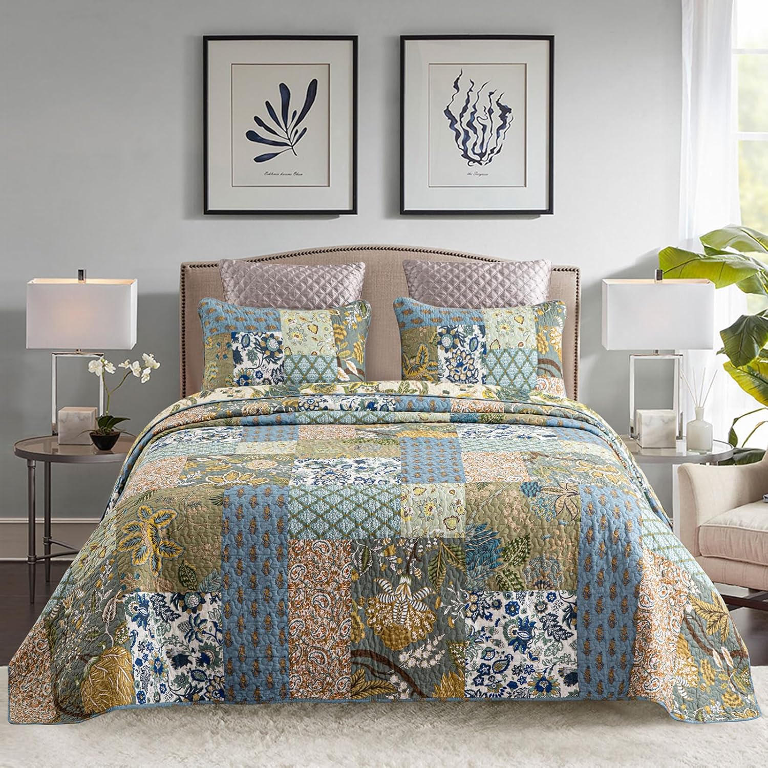 YAYIDAY Oversized Queen Quilt Patchwork Bedspreads (110x118 Inch) - 100% Cotton Reversible Breathable Green Leaves Quilted Coverlet with Pillow Shams for All Seasons