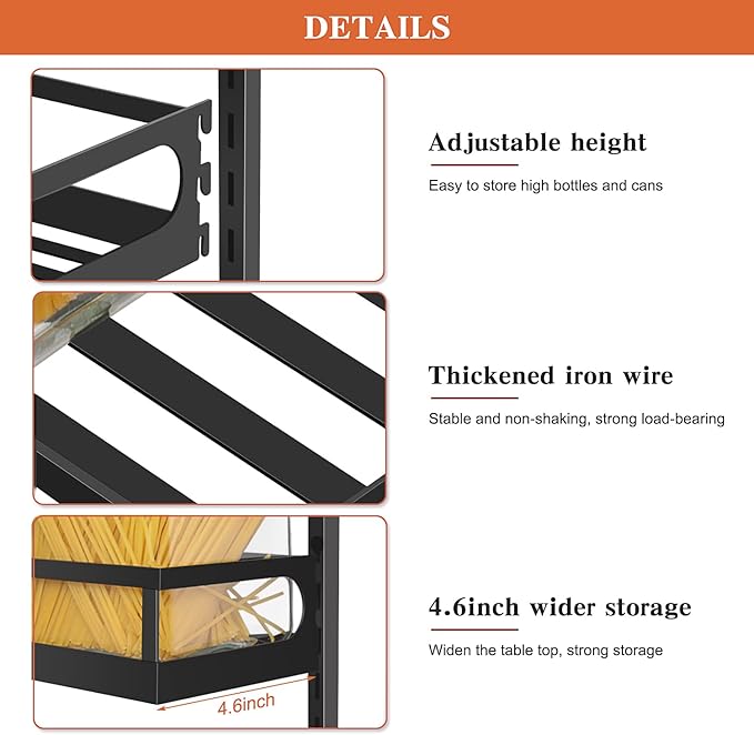• HEIGHT ADJUSTABLE: X-cosrack wall mounted spice rack can be adjusted up and down according to the height of jars; Mention that the 4.6-inch-wide basket is designed to fit larger items, such as big bottles and cans, providing compatibility with a wide range of kitchen essentials.