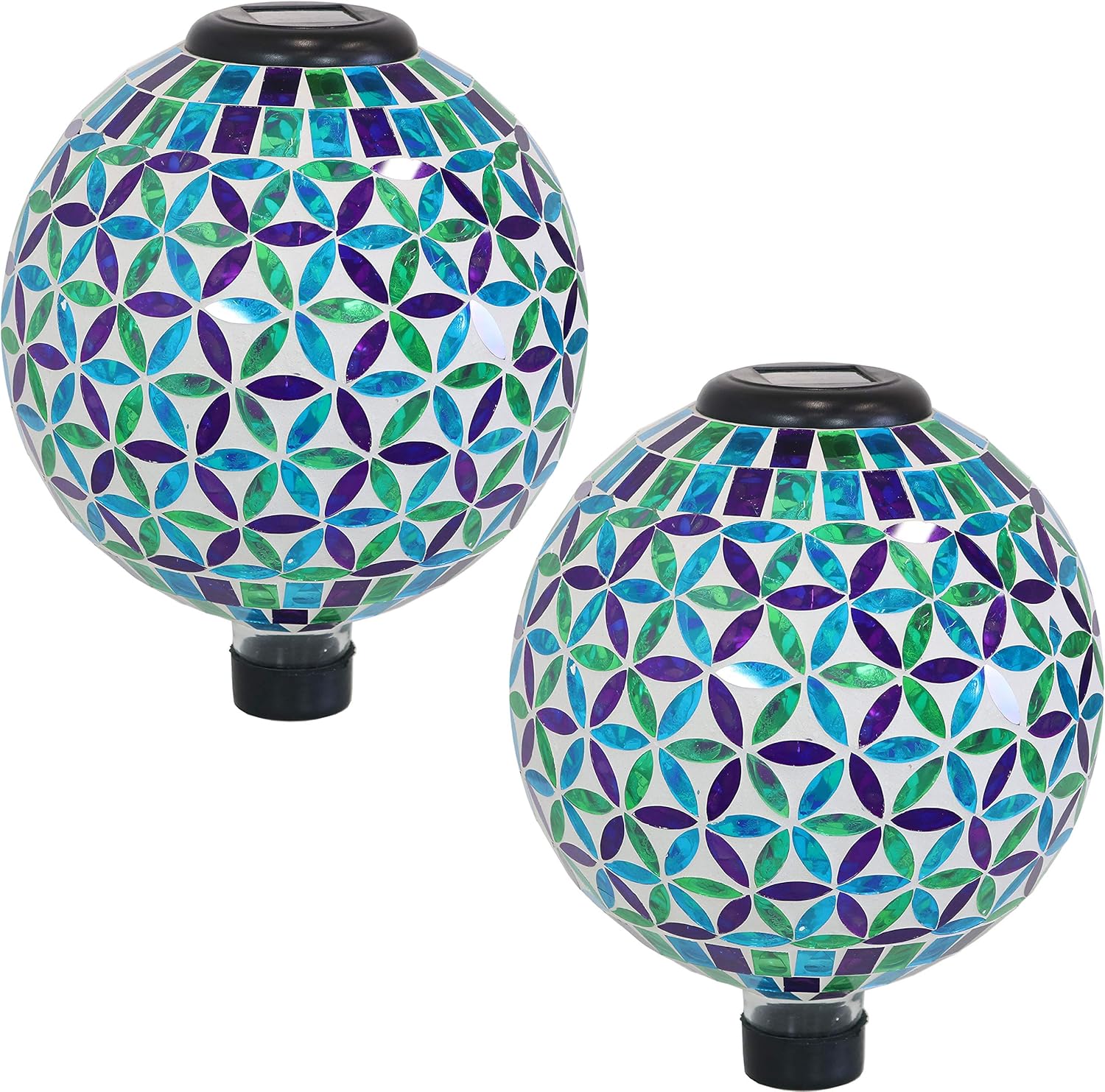 Sunnydaze Cool Blooms 10" Mosaic Glass Garden Gazing Globe with LED Solar Light - Set of 2