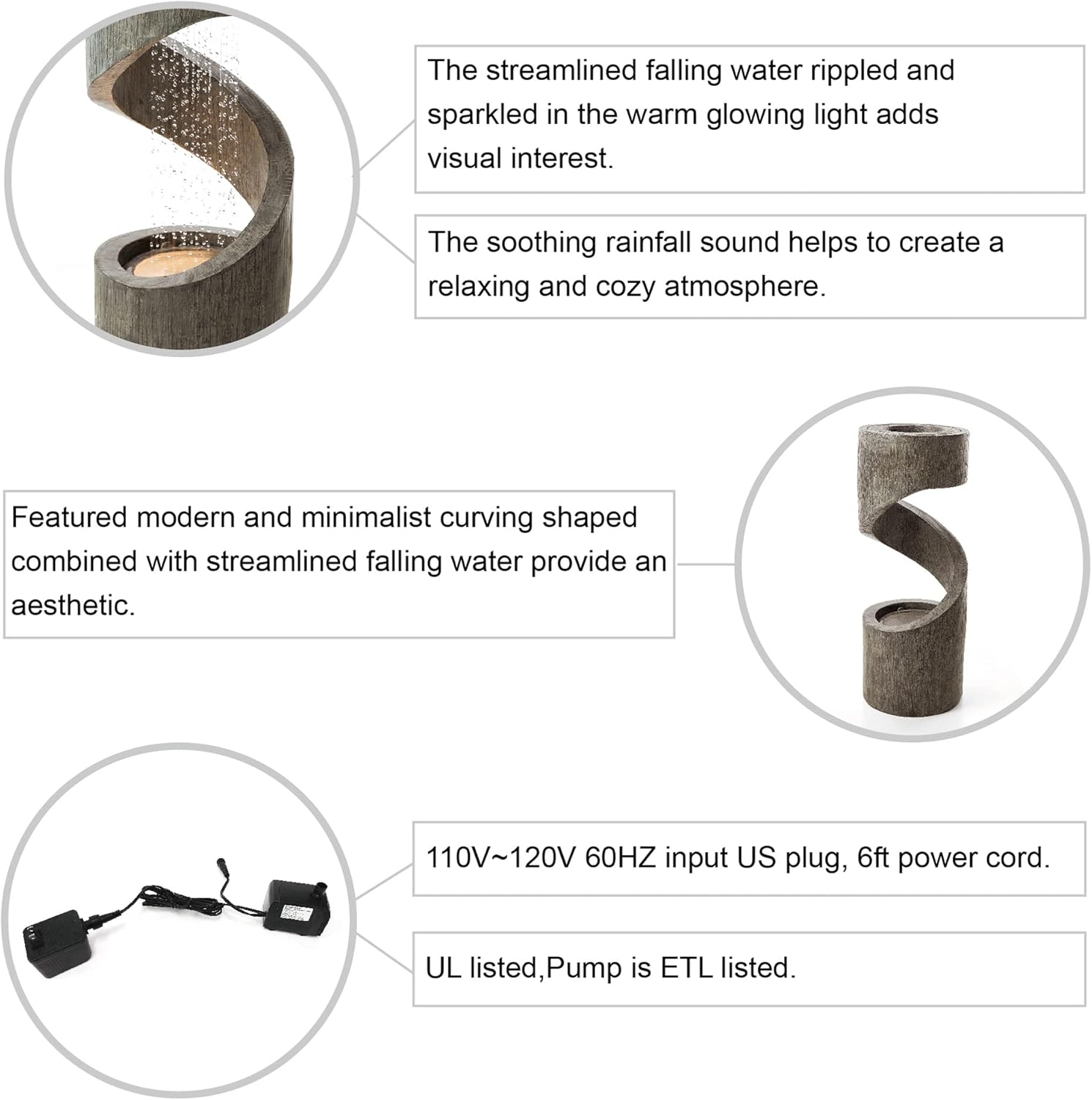 • Easy to Use: A UL listed pump with maximum 198 gph flow included, 110V~120V 60HZ, US plugs, 6ft power cord. You just need to add water to the fountain and plug it into a standard electrical outlet, and then you can enjoy the delightful sound of nature